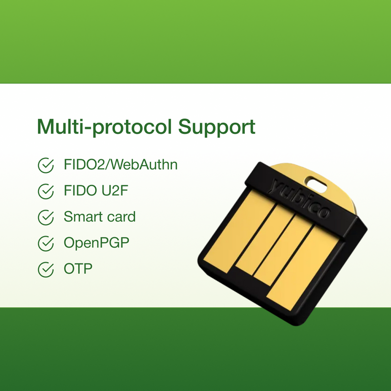 Multi-Protocol Support — Works across FIDO2, U2F, Smart Card (PIV), OTP, OATH, and OpenPGP