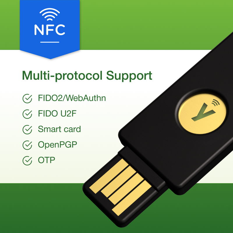 Protocols: FIDO2/WebAuthn | U2F | PIV (Smart Card) | Yubico OTP | OATH (HOTP/TOTP) | OpenPGP