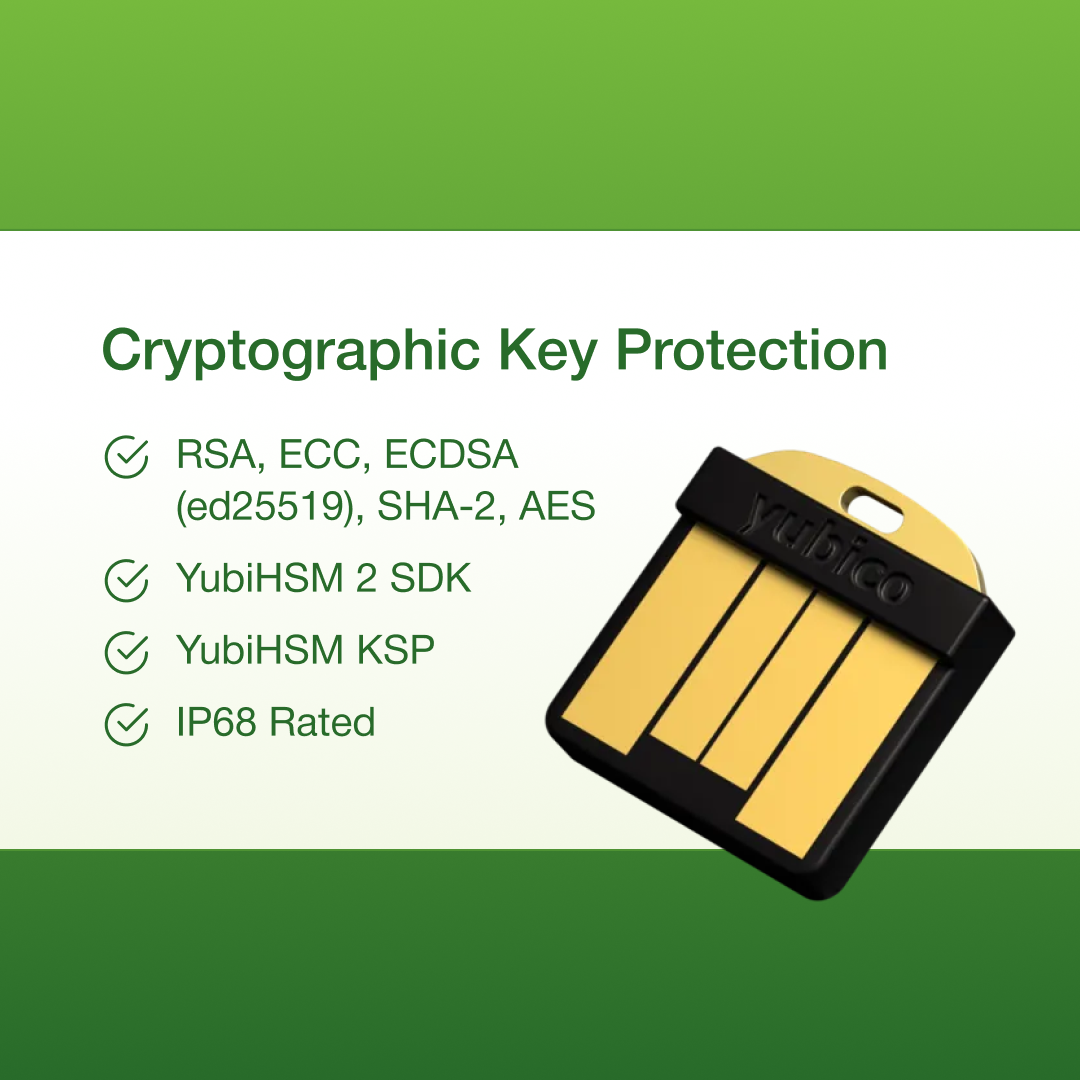 Compatible with Windows, macOS, and Linux environments through Microsoft CNG, PKCS#11, and YubiHSM SDK libraries. Ideal for enterprises, certificate authorities, and developers securing cryptographic operations, key management, and digital signing. Suitable for Active Directory Certificate Services, IoT gateways, blockchain exchanges, and any infrastructure needing trusted hardware-level key protection.